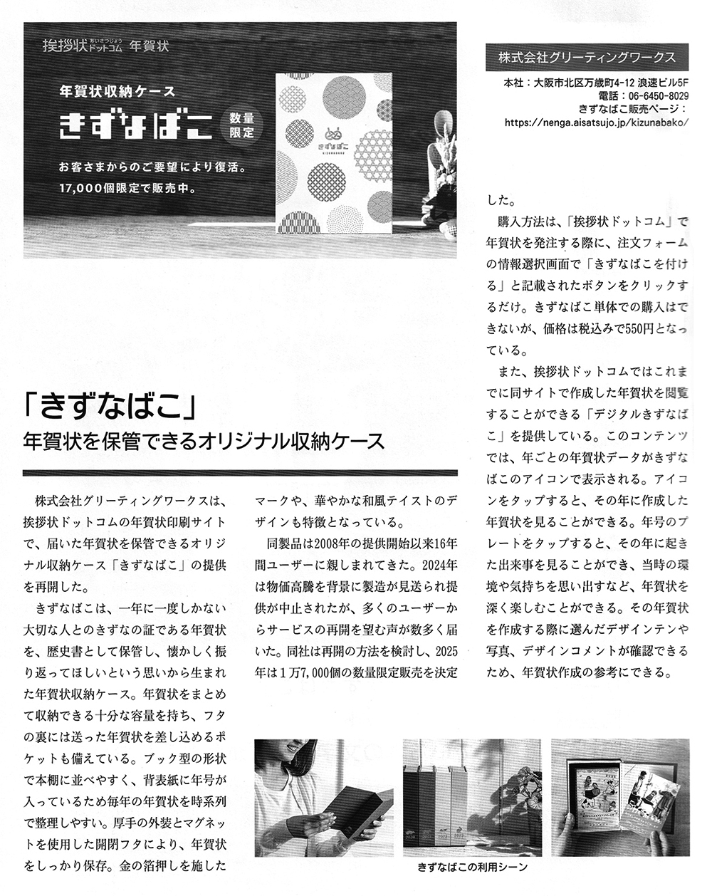 ニュープリンティング株式会社発行「月刊プリテックステージ」2025年12月号に、挨拶状ドットコム年賀状で販売する年賀状収納ケース「きずなばこ」の紹介記事が掲載されました。